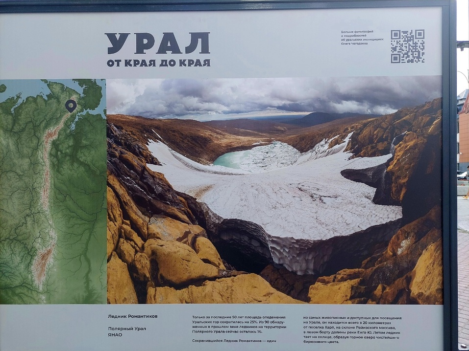 Ледник Романтиков — это самый доступный на Урале ледник, он находится недалеко от Лабытнанги, города в ЯНАО. Туда легко можно долететь на самолете из Екатеринбурга и оказаться на совсем другом Урале, не таком, как здесь. Обратите внимание на цвет породы — бурая, как на Марсе. Если не смотреть на голубое небо, то может создаться впечатление, что мы оказались на красной планете.
