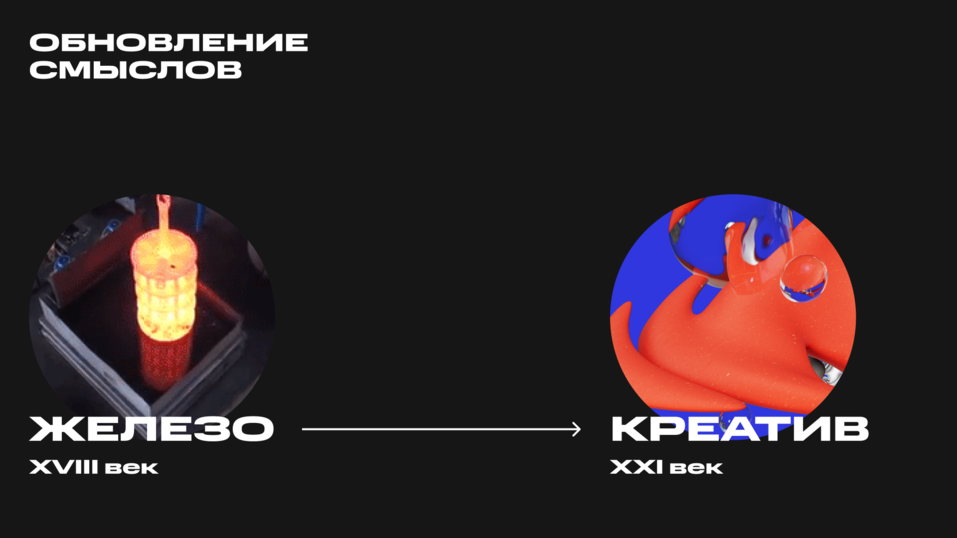Для производства железа были необходимы четыре элемента: вода, камень, огонь, воздух. Прошло время, смыслы изменились, а заводы остались. Сегодня благодаря все тем же четырем элементам на заводе создается новый ценный сплав. Он является квинтэссенцией деятельности и смысла производства. Раньше этим элементом было железо, а сейчас — креатив.