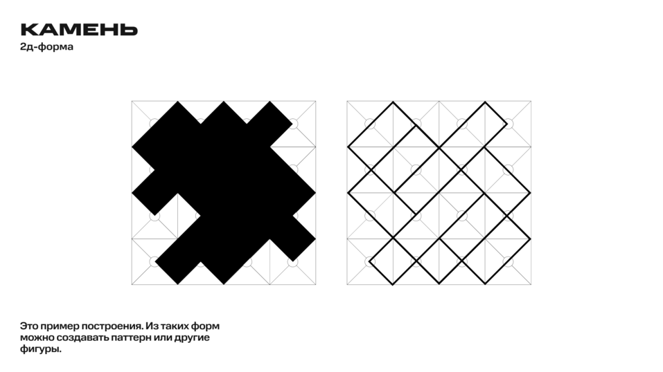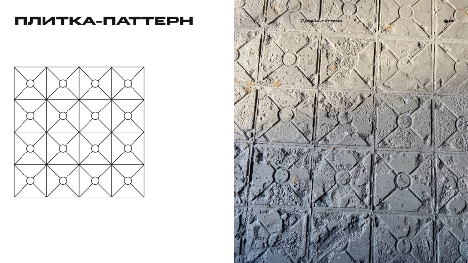 В заводских помещениях мы обнаружили отпечатки от металлической промышленной плитки. Они послужили вдохновением для интерпретации четырех элементов в 2д-формате.
