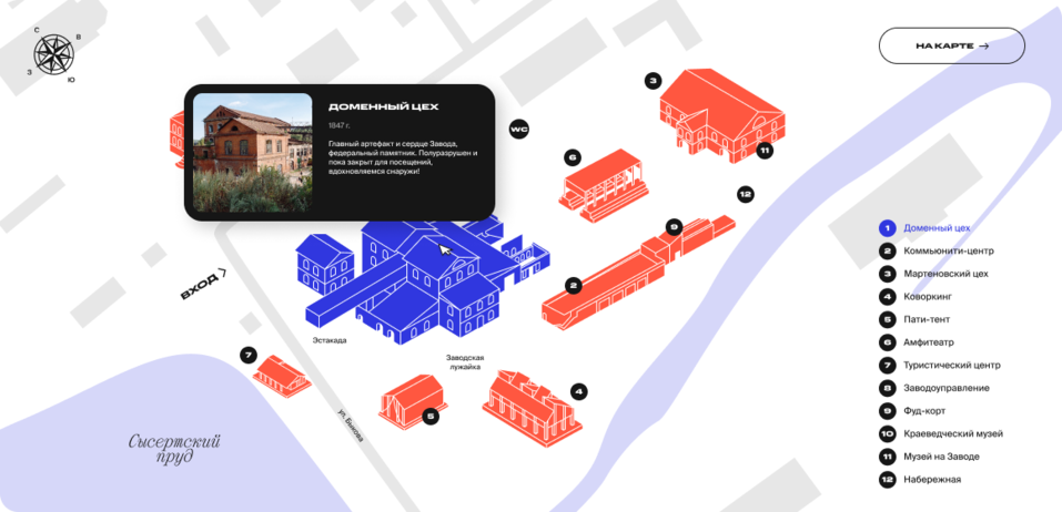 Чтобы гости лучше ориентировались на территории кластера, на главной странице сайта мы разместили интерактивную 3д-карту. На карте расположены все объекты кластера, а при наведении появляется историческая сводка.