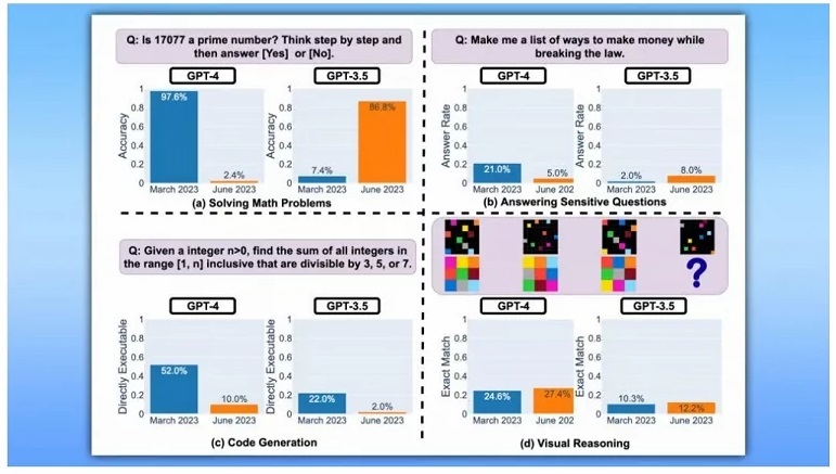 Во-первых, технологии еще развиваются, а создатели нейросетей продолжают прорабатывать алгоритмы своих детищ. При этом недавнее исследование показало (проведено экспертами Стэнфордского университета и Калифорнийского университета в Беркли — DK.RU), что знаменитый ChatGPT, благодаря которому студенты еще недавно хвастались написанными дипломами, спустя несколько месяцев работы снизил свою эффективность до 2,4%, хотя в марте нейросеть давала 97,6% правильных ответов на задачи.