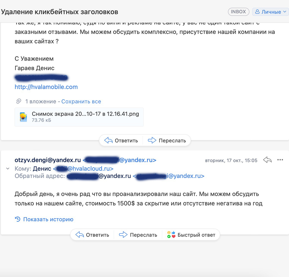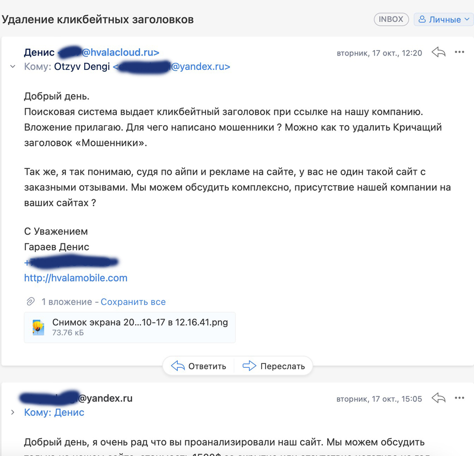— Мы нашли хотя бы какие-то контакты на этих сайтах, адреса электронных почт. И нам даже ответили, предложили продолжить общение по электронной почте или в Телеграме. В переписке там рассказали, что сделать, чтобы отзывы пропали. Заплатить. Суммы разные на разных сайтах, от 40 000 руб. до $1500.