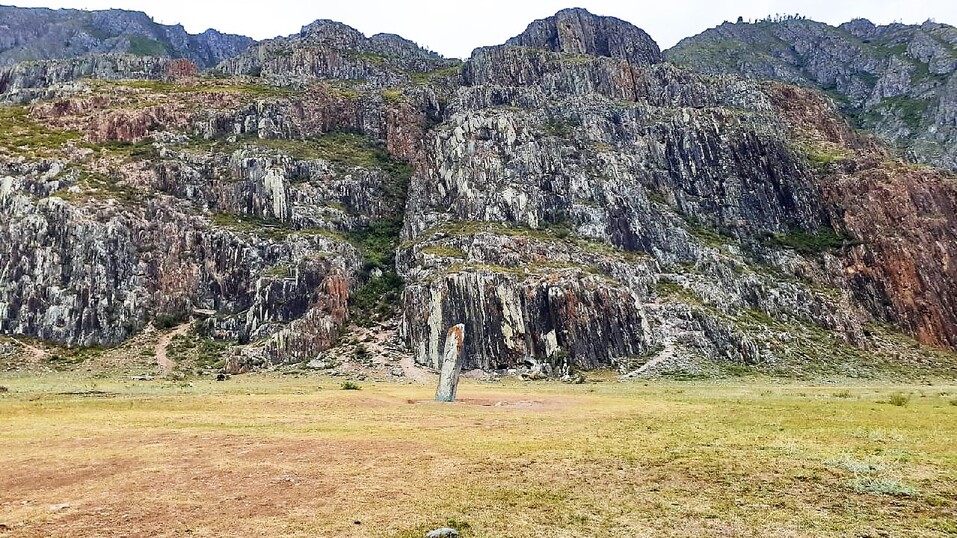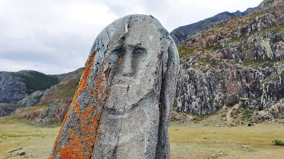 И еще один археологический комплекс Адыр-Кан — на правом берегу Чуи, на мощной береговой террасе у склона гор. С десяток разграбленных еще в древности курганов (на фото не различить), петроглифы на скалах все в том же скифском зверином стиле (олени с характерно завитыми рогами) и наиболее выдающийся артефакт — двухметровая стела, называемая «Каменный воин», именно так локация помечена на картах.