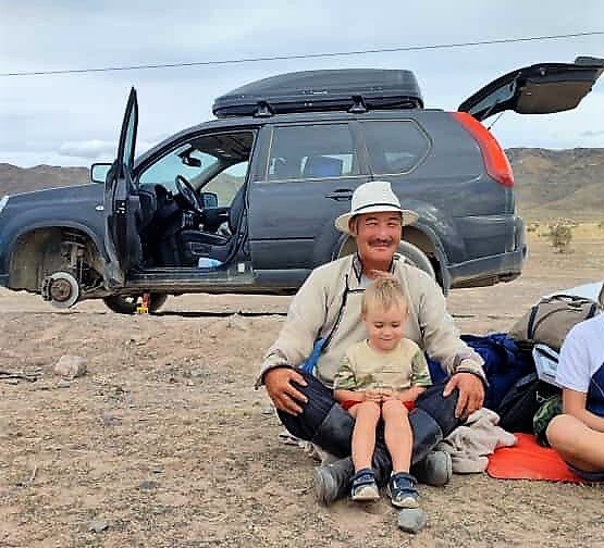 Нам очень повезло остановиться именно тут и испытать монгольское гостеприимство, потому что мимо нас как раз проехала семья монголов — первые люди, замеченные за весь путь. И они, увидев машину на домкрате, подошли, посмотрели, поцокали языками и, недолго думая, забрали меня, поврежденное колесо и запасную покрышку (штатную запаску я приберегал на случай второго прокола) и отвезли в единственную в селе шиномонтажку.