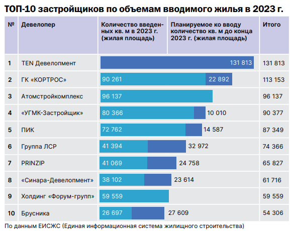 Согласно прогнозу, лидером по объему ввода жилья в 2023 г. может стать компания TEN Девелопмент — прогнозируется, что до конца года застройщик сдаст 131,8 тыс. кв. м. На начало октября у компании был самый большой объем портфеля в стадии строительства — 454,9 тыс. кв. м. Также в топ-3 по прогнозируемому вводу жилья вошли ГК КОРТРОС (прогноз на конец года — 113,2 тыс. кв. м) и Атомстройкомплекс (прогноз на конец года — 96,1 тыс. кв. м).
