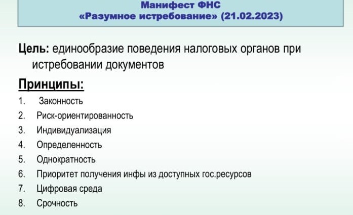 Если вы сталкиваетесь с избыточным давлением во время налоговых проверок по истребованию документов и информации, рекомендую обращаться к манифесту ФНС — он является ориентиром и ограничителем, который способен каким-то образом ввести требования налоговых органов в рамки закона и в рамки здравого смысла. Я бы еще апеллировал к тому дискурсу, который ведет ФНС устами своего руководителя. Даниил Егоров неоднократно озвучивал, что налоговый контроль должен быть взвешенным и обоснованным.