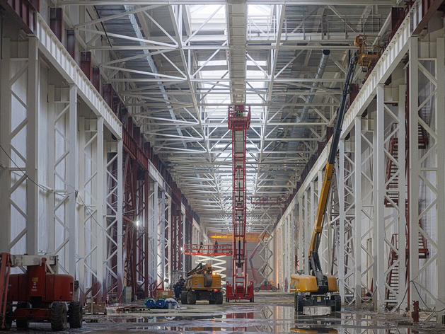 Корпус будет оборудован 11 мостовыми опорными кранами разной грузоподъемности – от 5 до 16 тонн. Высота подъема всех кранов составит 13 метров. Этот объект – самый масштабный из возводимых: длина здания – 420 метров, ширина – 57 метров. Общая площадь цеха превышает 32 тысячи кв. м.