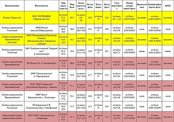 В частности, проверку не прошли «Брауншвейгская» от МПК «Атяшевский» (Саранск) и свиная сырокопченая колбаса производства «ФЭС» (п. Малаховка) — в этих образцах показатель «Белок» был ниже допустимого значения. Еще две колбасы — «Зернистая» и опять же «Брауншвейгская» от МК «Родина» и мясокомбината «Павловская слобода» — не прошли проверку по органолептическим показателям (продукция имела посторонний запах и кислый вкус). А еще одна разновидность «Брауншвейгской» — производства екатеринбургского ИП Жуков Д.А. («Жуковские колбасы») — оказалась не соответствующей нормативам по жиру и белкам.