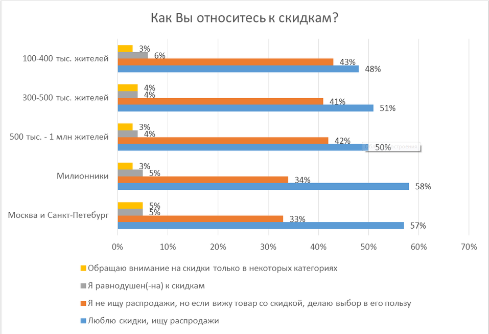Большинство россиян ищут скидки и любят распродажи, показало исследование Райффайзенбанка. Также в России популярны программы лояльности — в основном, в продуктовых сетях и магазинах одежды и обуви. В опросе приняли участие более 1,2 тыс. клиентов из городов с населением от 100 тыс. человек. И больше всего распродажи любят в больших городах.