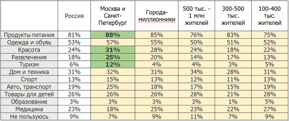 Большинство россиян участвуют в программах лояльности розничных сетей. 81% пользуются программами продуктовых магазинов, 53% — скидочными картами магазинов одежды и обуви. В Москве и Санкт-Петербурге заметно больше доля людей, вовлеченных в программы скидок в категориях «Продукты питания», «Красота», «Развлечения» и «Туризм».
