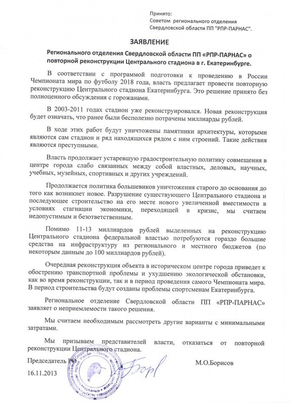 Так, заявление с возражениями против реконструкции подготовило свердловское отделение политической партии «Парнас». Его опубликовал в своем «живом журнале» секретарь регионального совета партии Михаил Борисов.