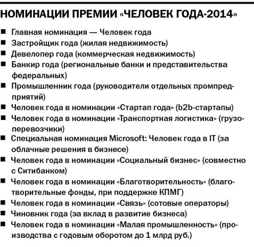 Поскольку премия «ДК» каждый раз отражает ситуацию на рынках за истекший деловой сезон, а 2013 2014 гг. стал не слишком радужными, сам список номинаций «Человека года» был пересмотрен. Такое решение одобрили и эксперты премии на июльской установочной встрече. По отзыву Андрея Бриля, полпреда Гильдии управляющих и девелоперов в Екатеринбурге и Свердловской области, премия «Человек года» закрепилась в сознании бизнес сообщества как награждение в первую очередь руководителей b2b компаний: