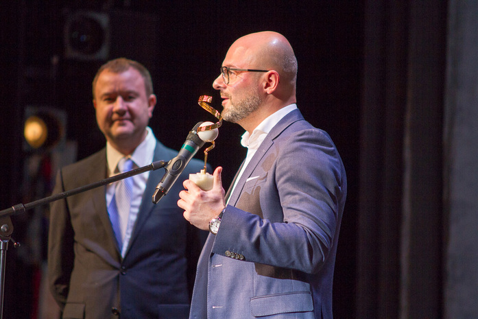 Победитель несколько раз провоцировал смех в зале своим остроумным ответным словом.