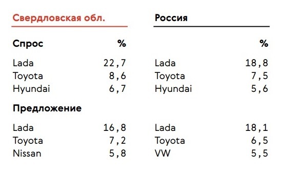 В Свердловской области ситуация похожая: Lada — лидер (22,7% и 16,8%). Это отражает общероссийскую тенденцию: рост спроса на автомобили отечественного производства и падение в предложении. Ближайший преследователь в Екатеринбурге — Toyota — проигрывает в несколько раз и по спросу (8,6%), и по предложению (7,2%). По спросу на третьем месте — Hyundai (6,7%), по предложению — Nissan (5,8%).
