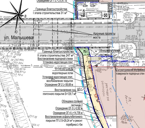 Этой осенью запланировано провести ремонт тротуара около дома №56 по ул. Малышева, рядом с которым находится «Доктор Скотч Паб», подпорную стену одноэтажного дома на ул. Малышева №31 также решено реконструировать. Кроме укрепления береговой линии Исети, согласно схеме работ, планируется благоустроить всю прилегающую территорию набережной: в частности, восстановить недостающие плиты и асфальтобетонное покрытие, облицевать ступени, установить ограждения, передает E1.Ru.