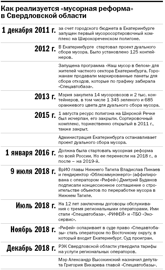 В Свердловской области отходы из населенных пунктов теперь вывозят на основании договоров с региональными операторами, которых в регионе три. Северную административно-производственную зону с центром в Нижнем Тагиле обслуживает компания «Рифей», Западную с центром в Первоуральске — «ТБО Экосервис», крупнейшую Восточную с центром в Екатеринбурге — ЕМУП «Спецавтобаза».