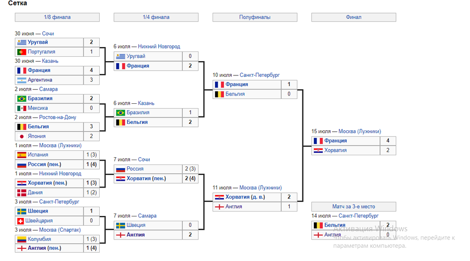 Сборная Франции по футболу в финальном матче Чемпионата мира победила Хорватию со счетом 4:2. Игра прошла 15 июля на московском стадионе «Лужники». Матч стал одним из самых результативных за весь чемпионат.