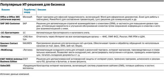 Развитая ИТ-инфраструктура стала для представителей целого ряда рынков конкурентным преимуществом. Это касается бизнеса любого масштаба. Разработчики отмечают стабильный спрос на внедрение систем управления и автоматизации, защиту данных, интеграцию технологических сервисов, решающих проблемы отчетности и обеспечивающих работу call-центров. Среди наиболее популярных готовых решений, которыми интересуется бизнес, — облачные сервисы на аутсорсинге, такие, как почта и резервное копирование данных. Из новых трендов — управление мобильными устройствами на предприятии, когда сотрудникам необходим безопасный доступ к корпоративной почте на своих смартфонах и планшетах. Предприятия сферы услуг внедряют сервисы для клиентской оценки своей работы. И в целом не осталось практически ни одной отрасли, которая не была бы вовлечена в электронный документооборот.