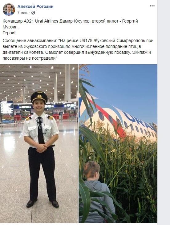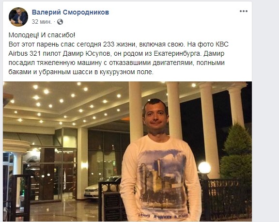 Сегодня утром самолет наших «Уральских авиалиний» совершил вынужденную посадку на поле в Раменском районе Подмосковья. Рейс летел из Москвы в Симферополь. По предварительной информации, в двигатель самолета попали птицы, начался пожар, и машину пришлось срочно сажать. <...> ВСЕ ЖИВЫ. Некоторые пассажиры получили легкие травмы конечностей, так как самолет садился без шасси. Экипаж уральской авиакомпании проявил фантастическое мастерство и выдержку. Командир воздушного судна — екатеринбуржец Дамир Юсупов. Герои. <...> Благодарю экипаж за мужество и профессионализм. Эти люди должны быть представлены к наградам. Компания «Уральские авиалинии» еще раз доказала, что не зря считается одной из самых безопасных в мире. Там тратят много сил и средств на подготовку сотрудников. И, как видите, это приносит бесценные плоды — спасенные человеческие жизни.