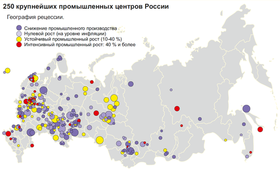 Меньше всего рецессия сказалась на центрах добычи нефти и газа, а также многопрофильных региональных городах и их спутниках в составе крупнейших агломераций, в особенности, Московской и Санкт-Петербургской. Ожидается, что промышленный рост по итогам 2013 года будет значительно меньше прошлогоднего и ниже уровня инфляции. Больше всего пострадают промышленные моногорода, которые нуждаются в модернизации и диверсификации экономики.