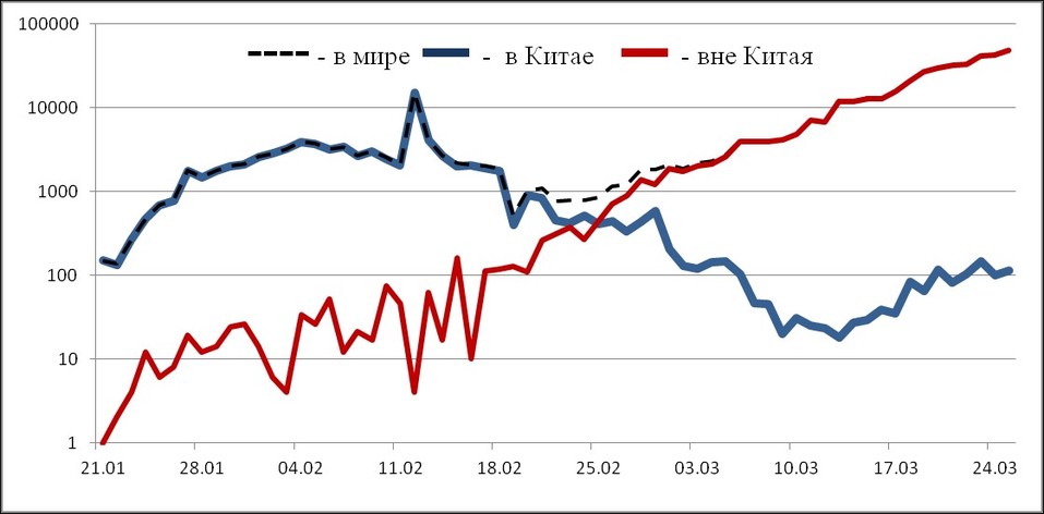 Эпидемическая динамика ежедневного выявления новых больных COVID-19 в Китае и мире. Графика: Роспотребнадзор