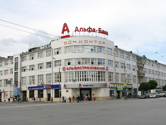 Здание строили для различных ведомств, банка и магазинов Союза сельхозкооперации. Проектировал объект Владимир Смирнов, который впоследствии, в 1953-1961 гг. был главным архитектором Свердловска и на этом посту разработал детальный проект ул. Свердлова. До войны в здании ничего не менялось, а в 1941 г. здесь размещался эвакогоспиталь № 1708. После победы жизнь Дома контор вернулась в привычное русло, он до сих пор выполняет свою историческую миссию. Отметим, что весной 1974 г. в здании случился большой пожар. Люди, отрезанные огнем, выпрыгивали с верхних этажей и разбивались насмерть. Многих спасли туристический палатки, взятые из магазина «Спорттовары» — их растягивали по типу тентов, чтобы смягчить приземление.