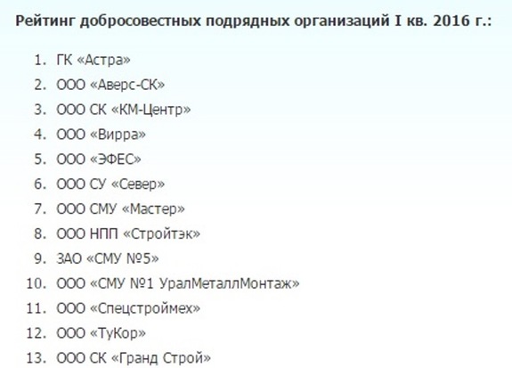 Гильдия строителей Урала составила рейтинг добросовестных подрядных организаций за I квартал 2016 г. Лидером, как и год назад, стала ГК «Астра», известная такими объектами как офис ТМК, спорткомплекс «Курганово», ЖК «Антарес», резиденция полпреда президента в УрФО, свинарник-откормочник на 2,5 тыс. голов и др. Серебро досталось фирме «Аверс-СК» (строит и обслуживает внешние инженерные сети, в I квартале 2015 г. компания довольствовалась «бронзой»), третье место — у СК «КМ-Центр», которая работала на стройках третьей очереди «Гринвича», автосалона Porsche на Сибирском тракте, СК «Олимпийский» и др. (в тройке – впервые).
