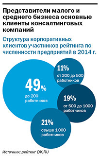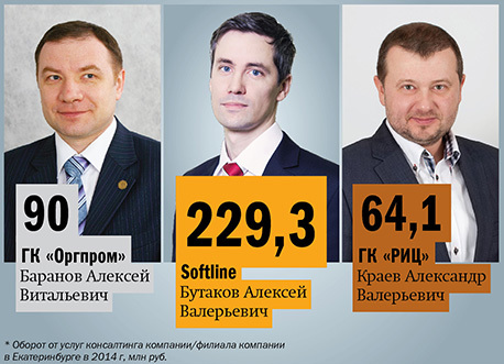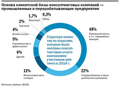 В тройку лидеров рейтинга портала DK.RU по обороту от услуг консалтинга в 2014 г. вошли: компания Softline и ГК РИЦ — специализируется на IT-консалтинге, а также ГК «Оргпром» — специализируется на управленческом консалтинге и является лидером в данном сегменте.