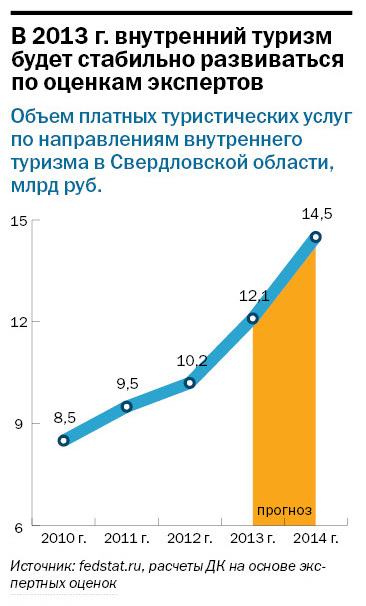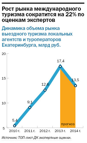 объем платных услуг по внутреннему туризму в Свердловской области в 2014 г. составил 13,3 млрд руб. с приростом 9% против 18% прироста в 2013 г. По данным участников рейтинга, в среднем объем оборота от выездного туризма компаний в зарубежные страны и по территории РФ вырос по отношению к 2013 г на 5%. Более удачным год был для туристических агентов — оборот их компаний увеличился на 14% и менее успешным для туроператоров — их оборот к 2013 г. сократился на 10%.