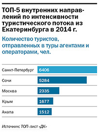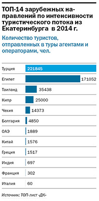 Спрос на зарубежные направления падает. Согласно данным участников рейтинга, в среднем в 2014 г. туркомпании отправили из Екатеринбурга в зарубежные туры на 7% меньше туристов в сравнении с 2013 г. В основном жители Екатеринбурга в 2014 г. отдавали предпочтения пляжному отдыху. ТОП-3 массовых зарубежных направлений возглавили Турция, Египет и Таиланд.
